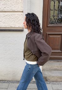 • Femme aux cheveux bouclés portant une veste marron, un pull kaki et un jean bleu, marchant devant un mur blanc texturé et une porte en bois.