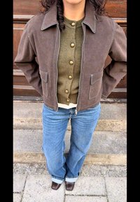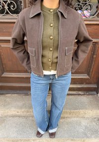 • Personne portant une veste marron, un cardigan kaki boutonné, un jean bleu clair et des chaussures marron debout sur des marches en pierre près d'une porte en bois.