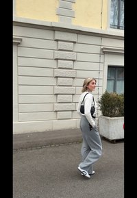 • Femme marchant sur le trottoir portant un pull blanc boutonné, un pantalon large gris, des baskets blanches, tenant un sac à main noir avec un foulard à motifs.