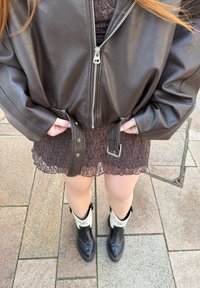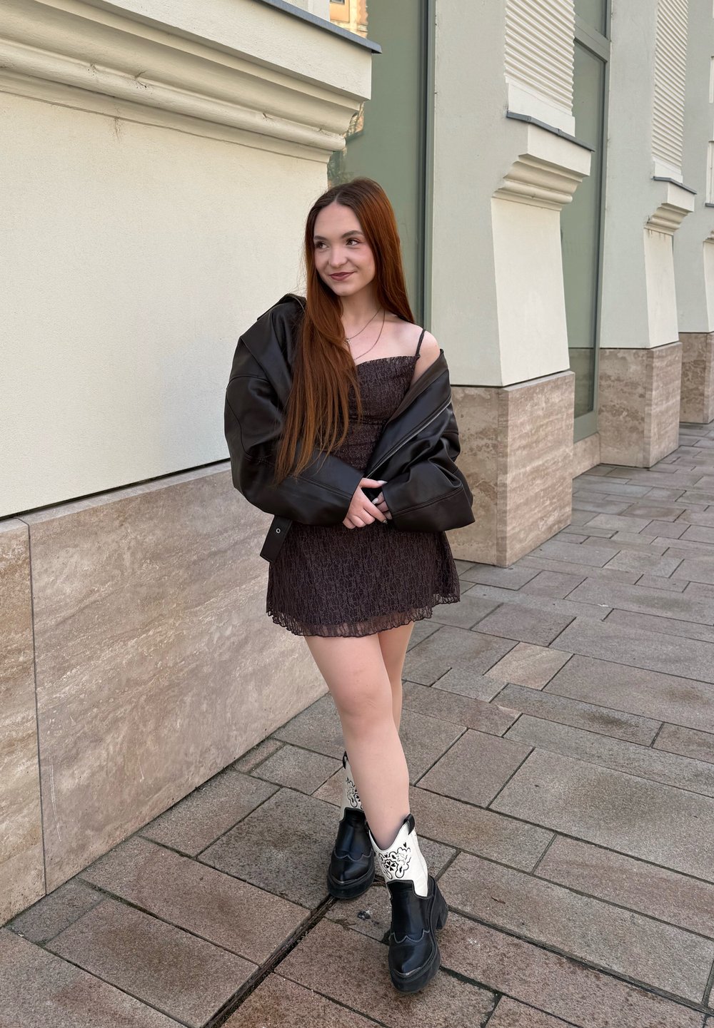 • Personne portant une veste en cuir marron avec ceinture défait, une robe sombre en dentelle et des bottines noires et blanches debout sur un pavé en pierre.