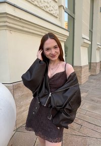 • Jeune femme aux longs cheveux bruns portant une robe en dentelle noire et une veste noire oversize, souriante et touchant ses cheveux à l’extérieur près d’un bâtiment.