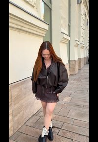 • Jeune femme aux longs cheveux roux, portant une robe noire, une veste en cuir oversize et des bottes noir et blanc, debout sur un trottoir pavé de pierres.