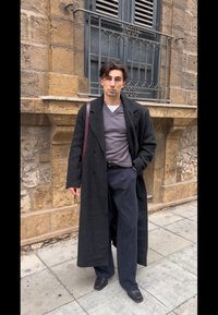 Homme debout sur le trottoir portant un long manteau noir, un pull noir, un pantalon large gris, des chaussures noires, les mains dans les poches près d'un bâtiment en pierre.