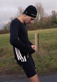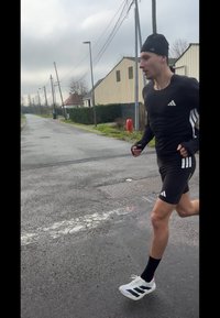 • Jeune coureur masculin portant une tenue de sport noire et un bonnet, ajustant ses vêtements au bord d'une route rurale avec des champs herbeux et des arbres dénudés en arrière-plan.