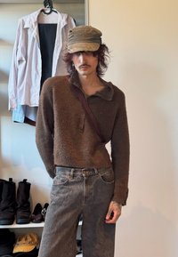 • Jeune personne portant un pull marron duveteux, un jean délavé et une casquette usée, debout devant des chemises suspendues et des étagères avec des chaussures.