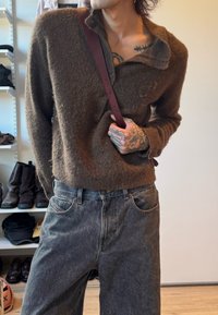 • Personne portant un pull en laine marron à boutons et un jean noir délavé, avec des tatouages visibles sur les mains et la poitrine et une bandoulière bordeaux.