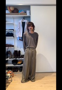 • Jeune personne en pull marron, jean gris à jambes larges et casquette se tient dans une pièce avec des étagères contenant des bottes, des chaussures et des vêtements pliés.