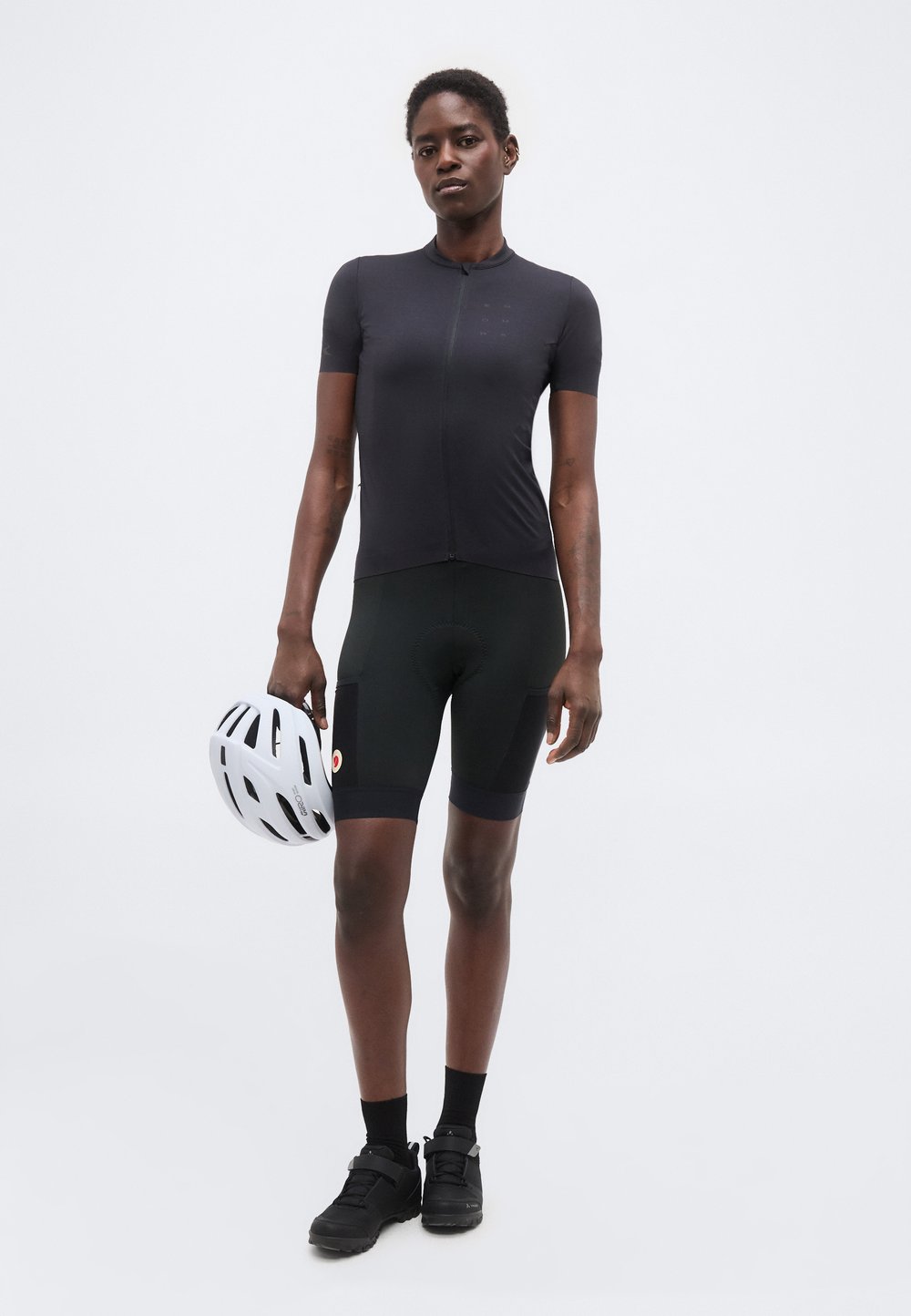 Maillot de cyclisme noir et shorts, chaussettes roses et chaussures de cyclisme noires. Vélo en arrière-plan sur une terrasse en bois avec un feuillage vert.