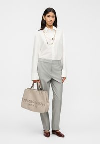 Veste courte marron avec des fermetures à l'avant, jean large bleu foncé avec des poignets gris, chaussures marron et un petit sac à main beige.
