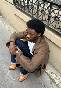 • Homme portant une veste marron, une chemise blanche, un jean et des mocassins beige, assis sur le trottoir près d’un mur beige avec une rambarde en fer forgé noire.