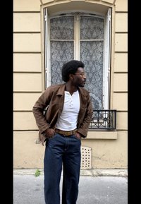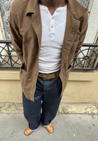• Personne portant une veste marron, une chemise henley blanche, un jean large foncé avec une ceinture marron et des chaussures camel, debout sur un trottoir.