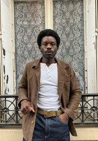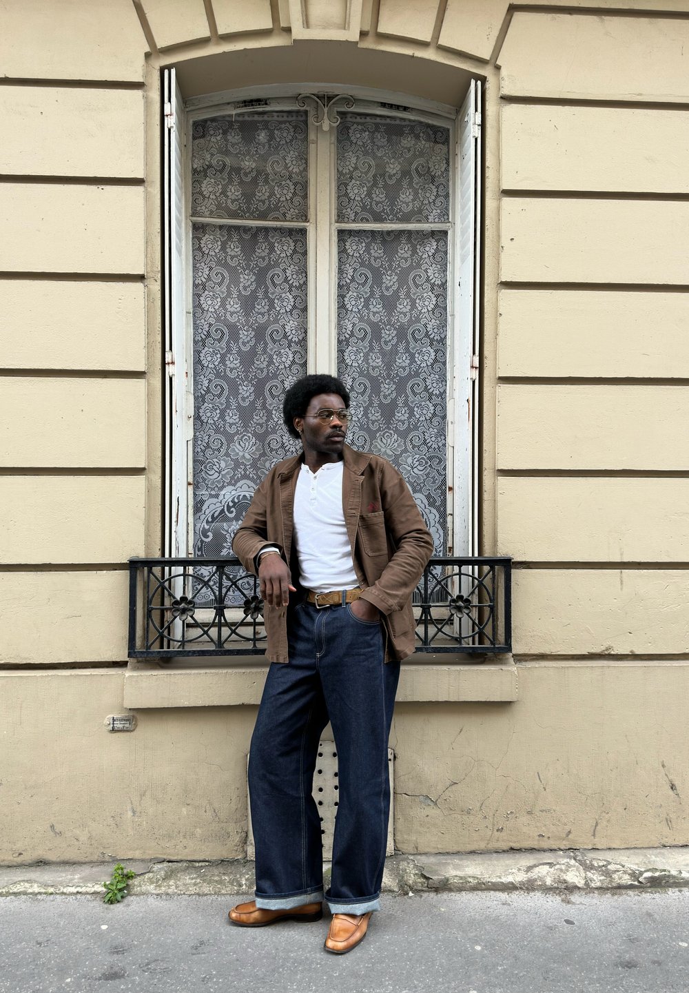 • Homme avec une coiffure afro, portant des lunettes, une veste marron, une chemise blanche et un jean, se tient devant une fenêtre avec des rideaux en dentelle et une balustrade en métal.