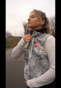 • Gilet sans manches gris et blanc avec un motif marbré, comportant un logo rose et une fermeture éclair. La couche de base présente un design textur�é blanc.