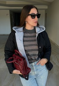 • Femme portant des lunettes de soleil, pull à rayures, veste matelassée noire sur un sweat à capuche gris, tenant un sac à main en cuir rouge, debout à l'intérieur.