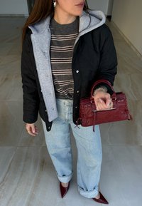 • Femme portant une veste matelassée noire sur un pull rayé et un jean bleu clair, tenant un sac à main rouge et portant des escarpins pointus.