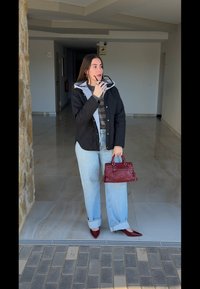 • Femme aux longs cheveux bruns, portant une veste noire, un pull rayé, un jean large bleu clair, des lunettes de soleil, tenant un sac à main rouge, debout dans un couloir.