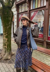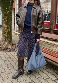 • Personne portant une veste en cuir marron, un pull marin, une jupe à carreaux et des bottes marron foncé montantes saisissant un sac fourre-tout bleu en tissu sur un trottoir.