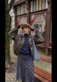 • Femme portant une veste en cuir marron, une jupe marine à carreaux, des bottes marron, un béret beige, tenant un sac bleu, debout sur le trottoir près d'une vitrine et d'un arbre.