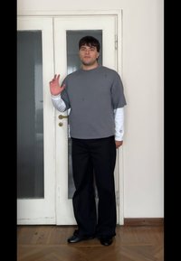 • Personne portant un t-shirt à manches longues blanc superposé sous un t-shirt gris à manches courtes, un pantalon noir, debout avec une main reposant sur l'autre près d'une porte en bois.