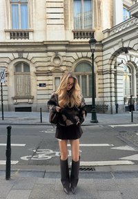 • Femme portant des bottes noires montantes, une mini-jupe plissée noire, un pull camouflage, tenant un sac à main noir, debout à un coin de rue en ville.