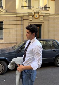 • Jeune homme en chemise blanche et cravate rayée tenant une veste grise, debout à côté d'une voiture bleue foncée garée dans une rue de la ville.