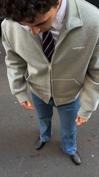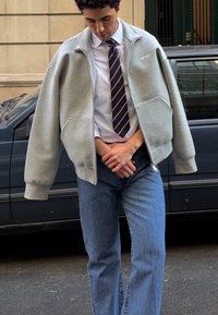 • Homme debout près d'une voiture, portant une veste zippée grise surdimensionnée, une chemise blanche, une cravate rayée et un jean bleu, les mains jointes devant.