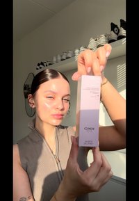 Haut sans manches cropped beige et jeans distressed gris foncé. Lunettes de soleil noires et petite caméra noire. Fond lisse de couleur gris clair.