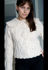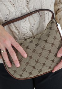 • Mains tenant un petit sac à bandoulière marron à motifs avec garniture en cuir, porté sur un pull crème en maille torsadée boutonné.