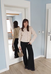 • Femme en pull beige tricoté et pantalon noir tenant un sac à main, debout près d'un miroir en pied dans une pièce bleu clair.