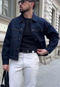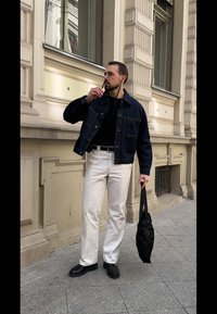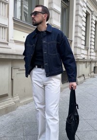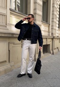 • Homme portant une veste en jean foncée, un t-shirt henley noir, un pantalon blanc, une ceinture noire, des lunettes de soleil, tenant un sac noir dans la rue en ville.