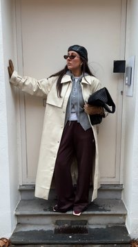 • Manteau oversize couleur crème, sweat à capuche gris, pantalon large bordeaux, chaussettes à motifs, gants, sac à main noir, lunettes de soleil foncées et casquette noire.