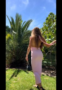 • Une femme en robe rose dos nu à col halter se tient sur l'herbe près de palmiers et d'arbres feuillus sous un ciel bleu clair.