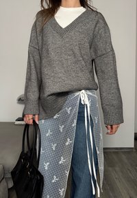 • Personne portant un pull gris à col en V par-dessus une chemise blanche, tablier en maille à fleurs noué à la taille sur un jean bleu, tenant un sac à main noir à l'intérieur.