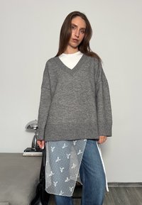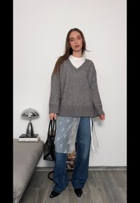 • Femme portant un pull gris surdimensionné, un haut blanc, un jean bleu à jambes larges, une superposition florale transparente, des chaussures noires pointues, et tenant un sac à main noir.