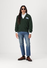 Cardigan tricoté vert olive avec col châle, fermeture à boutons, associé à un jean en denim bleu et des chaussures noires. Petit sac bandoulière noir.