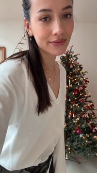 • Haut blanc à manches longues avec un col en V, associé à un pantalon noir et une ceinture texturée. En arrière-plan, un sapin de Noël décoré.