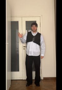 • Homme en pantalon noir, gilet noir sur une chemise blanche, et chaussures noires, debout de profil devant une grande porte verte ornée.