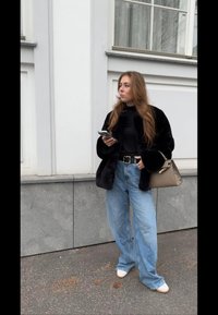 • Veste en fausse fourrure noire, jeans larges bleu clair et chaussures blanches. Tient un smartphone et un sac à main beige avec des accents dorés.