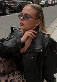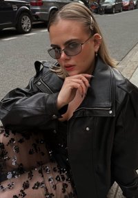 • Femme aux cheveux blonds portant une veste en cuir noire, une jupe transparente à motifs, des lunettes de soleil foncées et plusieurs boucles d'oreilles, assise dans une rue de la ville.