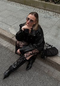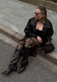 • Femme portant une veste en cuir noire, des collants transparents à motifs, des bottes noires et des lunettes de soleil, assise sur un trottoir avec un sac noir à côté d'elle.
