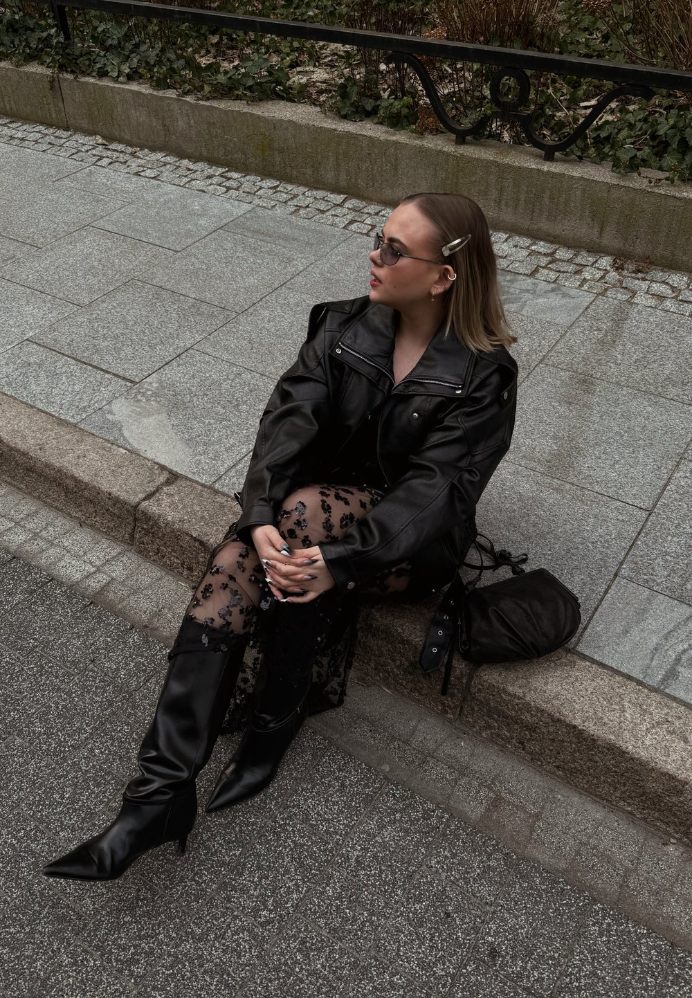 • Jeune femme assise sur le trottoir, portant une veste en cuir noire, une jupe fleurie transparente, de hautes bottes noires, des lunettes et une pince à cheveux, tenant un sac noir.