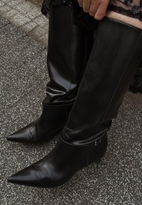• Bottes en cuir noires à bout pointu montantes jusqu'aux genoux, portées sur un pavé en pierre texturé, avec une main ajustant le bord supérieur d'une botte.