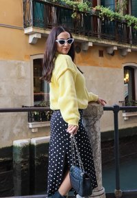 • Femme en pull jaune et jupe noire à pois tenant un sac à main noir, debout près d'un canal avec une balustrade en pierre et des plantes sur les bâtiments au-dessus.