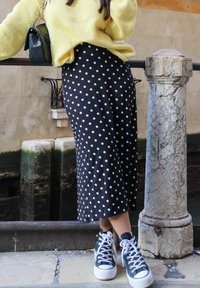 • Personne portant un pull jaune, une jupe à pois noirs et blancs, des baskets montantes noires, et un sac à main noir, appuyée contre une rambarde en pierre.