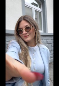 • Jeune femme aux longs cheveux portant des lunettes de soleil, un cardigan bleu clair, un blazer assorti posé sur les épaules, et un jean bleu, debout près d'un mur en pierre.