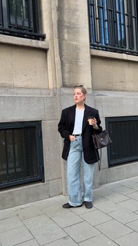 • Personne portant un blazer noir, une chemise blanche, un jean bleu clair, tenant une tasse de café et un sac tressé, debout sur un trottoir pavé.