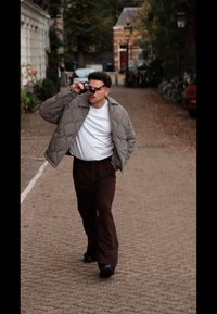 • Veste grise matelassée avec un col, t-shirt blanc et large pantalon brun. Des lunettes de soleil noires et des chaussures noires élégantes complètent le look.