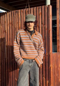 • Personne portant un pull rayé marron et gris, un jean gris à jambes larges, une casquette verte et un sac porté en bandoulière, debout contre une clôture en bois au soleil.