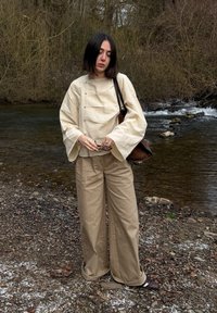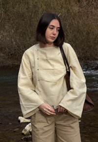 • Femme aux cheveux noirs en coupe bob portant un pantalon large beige et un haut ample crème, debout sur une rive rocheuse avec des arbres bruns et un cours d'eau en arrière-plan.
