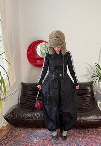 • Coupe-vent noir avec rayures blanches, pantalon noir surdimensionné, chaussettes grises, et un chapeau en fourrure ; tenant un petit sac bordeaux. Miroir circulaire rouge en arrière-plan.